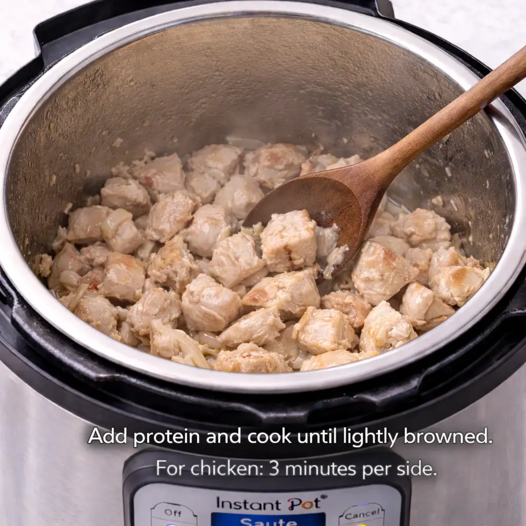 6. Brown the protein: chicken for 3 minutes per side, beef 2 minutes per side, tofu lightly.