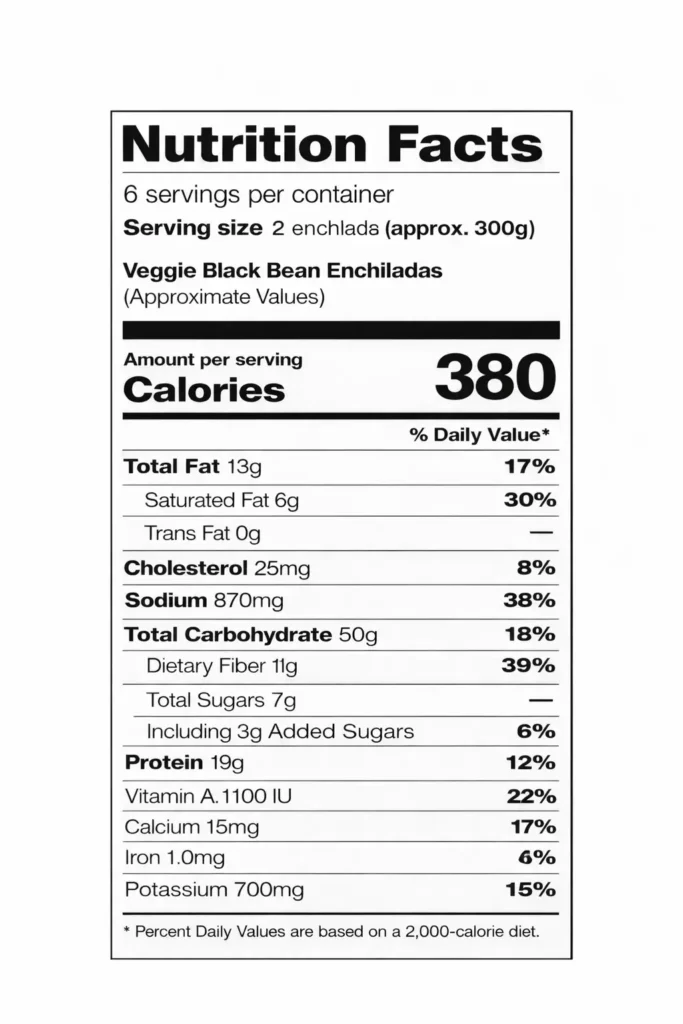 Veggie black bean enchiladas are a balanced and nutritious meal. They are rich in plant-based protein, fiber, and a variety of vegetables. Using moderate cheese and whole ingredients keeps them wholesome and satisfying.